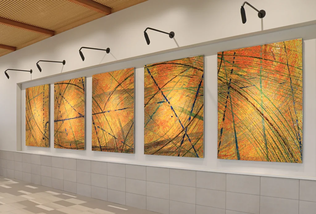 Evocative of quilted fabric stitching, the Flight Pattern Quilt is inspired by flight trajectories, con trails, golden light, and wind currents. The artwork complements the surrounding architecture and references the region’s fiber and craft heritage.